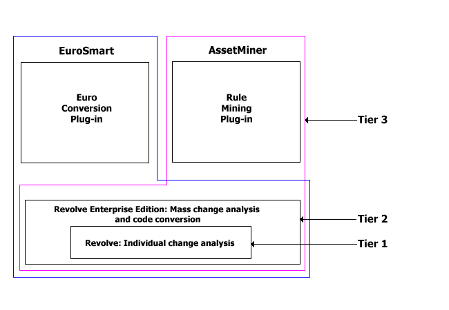 The blue box shows what is contained within the EuroSmart product, and the pink box shows what is contained within the AssetMiner product. Both are in tier three.