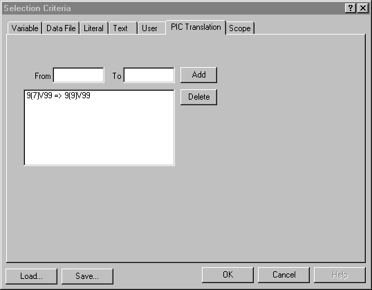 The Modification Driver translates 9(7)V99 PIC clauses to 9(9)V99 in selected variables. When it encounters a PIC clause that is not 9(7)V99, it displays the PIC Translations tab for you to add further trnaslations if you want to. Notice the name of the variable is displayed along the top of the tab.