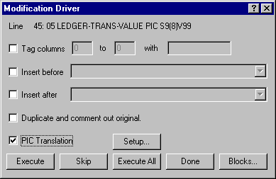 The Modification Driver dialog box opens, referencing the first selected item. Use this dialog box to specify which code modifications you want to implement. The modification driver can insert blocks of text, tags, and other user-defined information into the source code of selected elements. In this case we want to implement the PIC translation for 9(7)V99 PIC clauses.