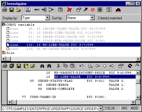 Revolve checks time stamps on COBOL files to see which files have been modified. ONLINE1.CBL contained the changed PIC clauses. It displays a status of Out of Date.