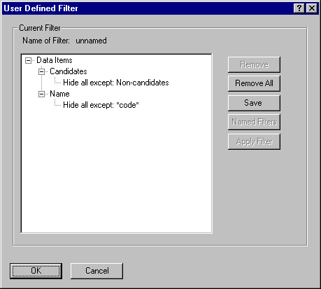 The User-defined Filter dialog box shows all filters that are currently applied.