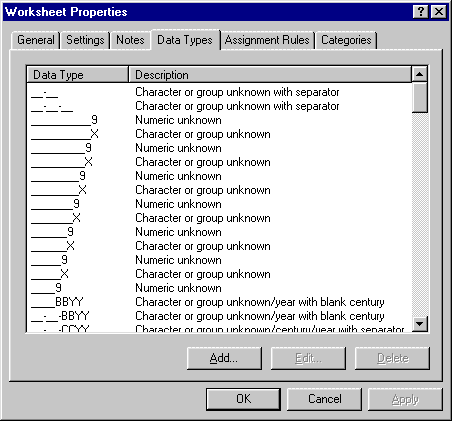 Data types can be allocated when you add a set to the worksheet either automatically or manually. Alternatively, you can scan the worksheet for items without a data type and add them manually on an individual basis. A data type cannot be allocated to a data item if the size of the data item does not match the range specified for the data type.
