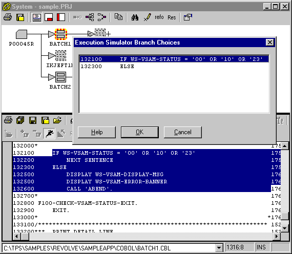 The code executes slowly, while displaying the logical procedural flow. The walk through is displayed, item by item, in the Execution Path display. Wait until execution pauses when an IF statement in the code is encountered, and the Execution Simulator Branch Choices dialog box opens.