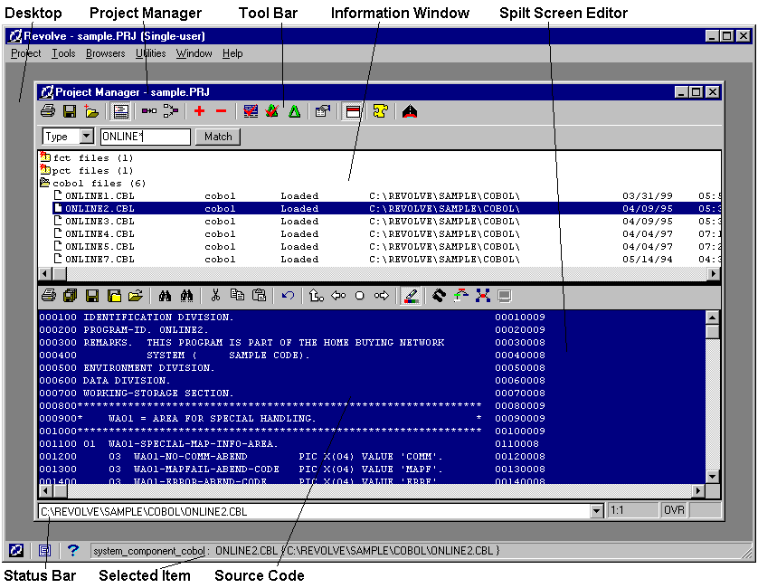 The Desktop houses all of Revolve's features that enable your system analysis. It is displayed when Revolve is invoked. The menus and tool bars accessible from the Desktop enable you to create and open projects, as well as invoke the necessary features needed to address your analysis. All of the windows, tools, views, browsers, and dialogs used in conjunction with this environment are contained in the Desktop.