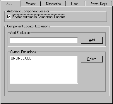 The ACL is enabled by default on the ACL tab. It works in conjunction with the Search Directories feature to locate directories containing necessary source components. If you want to use the ACL, you should set up search directories before adding components to a project. The best way to do this is to use the Add Components dialog. Select the directory that contains referenced source components. Set the Type to the type of the referenced components. Then click Add Search. When you add the subset of project modules, the search directory is used to load referenced components. For an example of adding search directories, refer to Creating a Project in the Getting Started book.