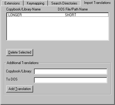 The DOS Translations tab enables you to map DOS drives, directories, and file names to other file names and directories. This feature is useful when a project has been built on a drive that appears to have different logical paths to different users. For example, if a project has been built on one user's workstation where the source files are located on a logical path beginning with U:\SOURCE\DTE.CBL and those same source files are stored on a second user's workstation on the logical path C:\PROJ\TEST.CBL then a file name translation can be used to map the original settings to the secondary user's parameters.