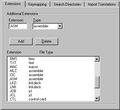 The Extensions tab enables you to allocate a supported file type to an unrecognized extension. An extension is a three character string that is separated from the file name with a period and identifies the file's type. Revolve references the extensions defined in the Extensions tab when loading files by automatic typing. Automatic typing is performed when automatic is selected in the Add Component dialog's Type field. It signals to the parser that file extensions define file type. For example, when adding the component ONLINE1.CBL's extension is CBL. .CBL indicates that ONLINE1 is a COBOL file. The parser recognizes the extension .CBL as a COBOL file and loads it into the project accordingly.