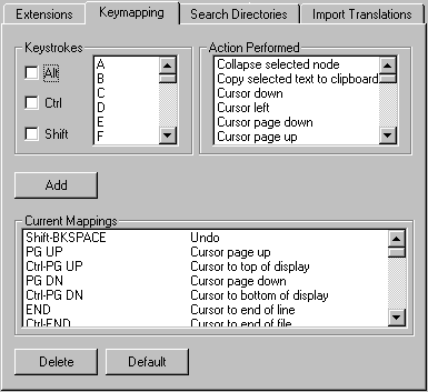 The Keymapping tab, enables you to create keyboard shortcuts for frequently performed operations in the Integrated Editor. Keymappings are very useful for customizing the editing environment. They make editing more efficient because common operations and functions are initiated from the keyboard, cutting down on mouse usage.