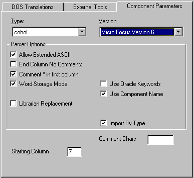 The Component Parameters tab contains options that determine how system files are handled in your project. These options serve as default settings for all components based on type as they are added to the current project. For example, all COBOL files that are added to the project are given parameters based on these settings. If you change COBOL settings, all COBOL files that are already loaded in the project are not affected. The new settings are applied to new COBOL files that you add to the project.