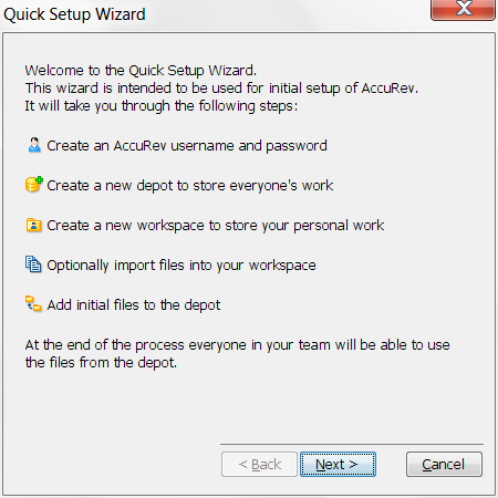 2. Review the quick setup process, then click the Next button to start the wizard.Note: Names for all AccuRev entities (usernames, depot names, workspace names, and so on) are case-sensitive. Usernames john and JOHN are considered to be different, for example.