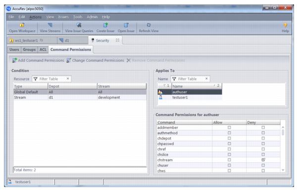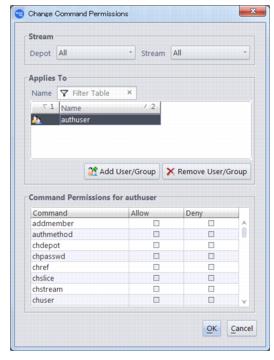 Release 7.1 introduced a new graphical user interface that enables the AccuRev administrator to configure which users are allowed to execute a variety of administrative level commands. This is an alternative to writing perl script in the server_admin_trig.bat or server_admin_trig.pl files installed in the <ac-install>/storage/site_slice/triggers directory.This configuration page is accessible from the Admin menu underneath the Security option. The “Global Default” Condition allows you to configure admin command permissions for the entire site. Command permissions can apply to an individual user or to a specific group of users. You can also apply permissions broadly to the two built-in groups:In the case that permissions have been configured for both a user directly and a group that the user is a member of, the permission setting closest to the user is the one that applies. For example, if a user is a member of the qa group and the qa group is denied access to the chstream command, but the user is specifically configured to be allowed permission to the chstream command, the user’s own permission is the one that applies.In order to set or remove admin command permissions, you must either be a superuser or have been granted explicit Allow permission for the setcmdacl and rmcmdacl commands. To designate a user as the superuser, the AccuRev administrator must use the maintain utility:Either highlight the condition you want to edit and click the Change Command Permissions button, double-click on the condition, or right-click on the condition and choose the Change Command Permissions context menu option. The following dialog will appear:For commands that apply to a stream or stream hierarchy, you can add a new condition for that stream and configure command permissions that you want to apply to it only. You can also choose to make your command permission setting inheritable so that it applies to the entire stream hierarchy below the specified stream. For example, suppose you want to allow users to change the streams in the development stream hierarchy, but you don’t want anyone to change streams above that level. To accomplish this, you could deny access to chstream in the global default, but set an explicit inheritable Allow permission for the chstream command on the development stream:To remove a condition entirely (except for the Global Default Condition), highlight the condition and click the Remove Command Permissions button. To remove command permissions for a specific user or group from a condition, highlight that condition and select Change Command Permissions. In the dialog that pops up, remove the users and groups that you no longer want permissions to be set for.