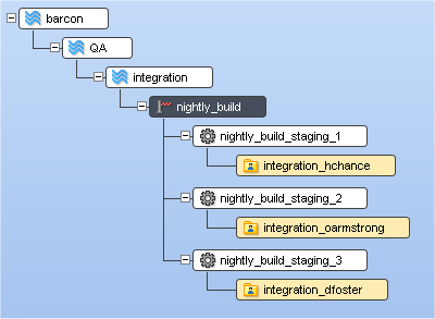 A staging stream is a child of a gated stream that AccuRev creates automatically when you create or reparent a stream or workspace off the gated stream. You cannot create staging streams explicitly (nor can you reparent them). The following illustration shows a staging stream,