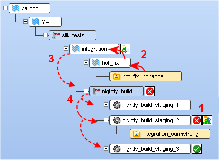nightly_build_staging_2. Unfortunately, his changes broke the build, and the trigger returned a status of "failed". Note that his changes remain in the staging stream’s default group. Shortly thereafter, before he has the opportunity to promote his fixes, (2) user