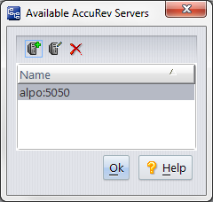 The Available AccuRev Servers dialog provides a way to maintain the list of AccuRev Servers to which you can login. Each