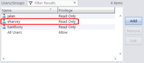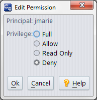 4. Click the Add button.Note that the list does not include any principals for whom privileges have already been defined for the selected elements. In this example, users banthony and jalan do not appear because privileges have already been set for them for the selected element. (Use the Edit action to change existing privileges. See Editing Permissions for more information.)Note: Changes that you make to permissions take effect as soon as you click the Ok button in the Add Principals dialog box.