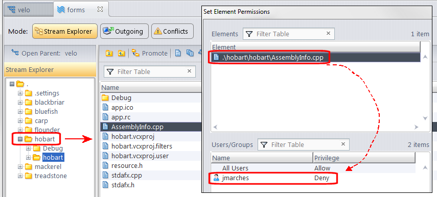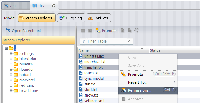 This section describes how to manage EACLs in the AccuRev GUI. You can also manage EACLs using the CLI. (Changes that you make using one interface are reflected in the other.) See the section eacl in the AccuRev CLI User’s Guide for more information on using the CLI. See Element-Level Security (EACLs) of the AccuRev Administrator’s Guide for more detailed information on EACLs, permissions, and privileges.If you change the privilege for an element in the velo_dfoster workspace, that change is automatically reflected in all the other streams in the depot; the same is true for changes made to an element’s privileges in, say, the int stream. In other words, you do not have to promote an element or update a workspace to propagate changes to its privileges throughout the depot.