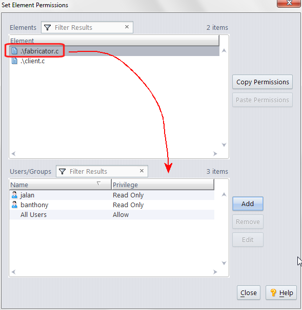 6. If you selected a directory in Step 1, AccuRev asks whether you want to apply the privilege recursively to all elements in that directory. See Setting Permissions on a Directory for more information on this topic.The change you made appears in the Users/Groups list box. Here, for example, we see that the privilege for user eharvey has been changed from Allow to Read Only for the element selected in Step 3: