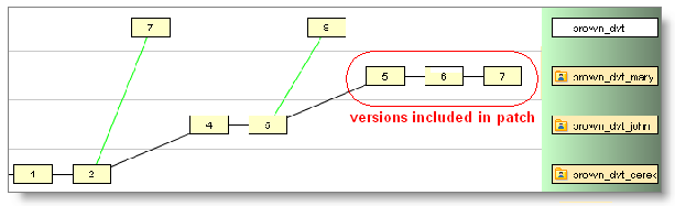 When John patches version brown_dvt_mary/8 into his workspace, AccuRev decides that only the versions since the promotion — versions 7 and 8 — contain "recent changes". The idea is that a promotion typically marks the end of a programming task, not an intermediate checkpoint.