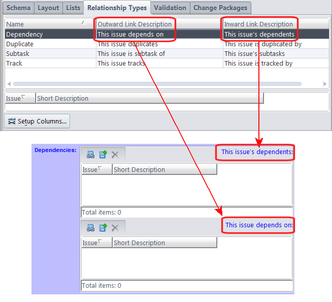 • Track: This relationship type is used internally by AccuWork to track change package gaps.The edit-widget for a field whose data type is Relationship is a table. It displays selected fields from all the other issue records that are related, through a particular relationship type, to the current record.On this subtab, you specify -- for each relationship type -- which fields from a set of related issue records are to be displayed in a Relationship field.