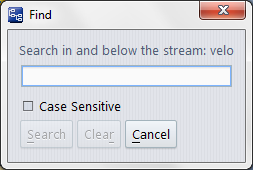 Type characters in the text box that match all or part of the stream name(s) you are looking for. Make sure the Case Sensitive option is set as desired. You can enter any character that is legal for an AccuRev stream name. Wildcards ("*" and "?") are accepted. The find operation will match the string in any part of the name. So for example, performing a case-insenstive search for "Devel" will return streams with names like "devel_stream", "Old_Development".