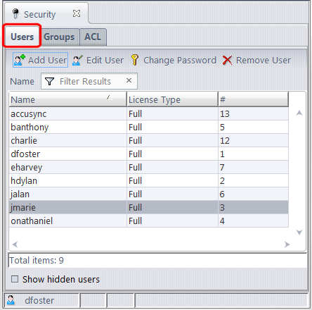 • Before executing any AccuRev commands, you must Login as a particular user.Choose Admin > Security from the GUI main menu to display the Security tab. Then, click the Users subtab.(appears if Show hidden users is checked) Inactive indicates that the username has been removed, and can't be used in a Login command, or in the definition of an ACL entry or a lock. A removed user can subsequently be Reactivated.The username. You can change a username (for example, from derek to dpost) without disrupting AccuRev's bookkeeping, because it tracks user identities by their unique, immutable integer IDs.A user cannot have the same name as any other user, or the same name as any group. See User-Specified Names for AccuRev Entities.The integer that uniquely identifies this user. This number cannot be changed. Note: The same "namespace" of integer IDs is shared by users and groups.If checked, the table includes users that have been deactivated with the Remove command. This also adds a Status column.Note: In order to successfully add a user, there must be at least one available user license.