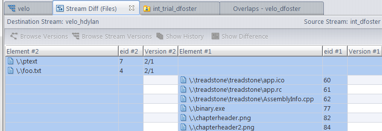 The Stream Diff (Files) tab contains a table, each row of which details one element. Above the table is the name of the Destination Stream (the one you selected with themouse pointer) and Source Stream (the one you selected before invoking the command).