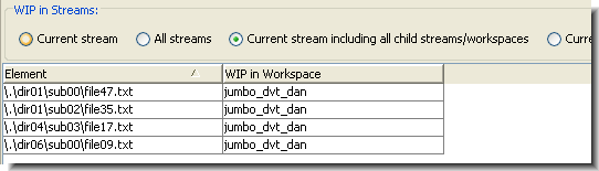 WIP: Identifying Work in Progress The WIP ("Work in Progress") tab shows elements that are currently active in the workspaces below a specified set of one or more streams. (A stream's own default group is not included in this listing.) Opening a WIP Tab Select a dynamic stream in the StreamBrowser, and choose WIP from its context menu. WIP Tab Layout Element (or separate "Name" and "In Folder" columns) The element's pathname within the depot. WIP in Workspace The workspace in which the element is active. Working in a WIP Tab Use radio buttons to specify which stream -- or set of streams -- whose workspaces are to be searched for active elements: Current stream The stream you selected when invoking the WIP command. All streams All streams in the depot. Current stream including all child streams/workspaces The entire subhierarchy of streams below the one you selected. Current stream including all parent streams/workspaces The entire backing chain of the stream you selected. A workspace is searched for active elements if it is a direct child of one of the streams you've indicated with your radio-button choice. (But pass-through streams are ignored when determining the "direct child" relationship. Workspaces whose parent is a pass-through stream are treated as if they were backed but their "grandparent" stream.) The WIP tab display is informational only. You cannot change the status of elements from this tab. See also: Working with Tables.