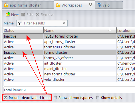 Inactive indicates that the workspace is currently deactivated. Inactive workspaces can be reactivated. See the Remove and Reactivate commands below.