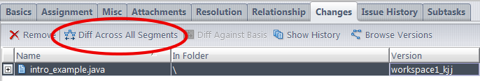 Diff Across All Segments option. When you use this feature, the diff shows all changes to the file that were promoted against a single issue while ignoring any changes to the file that were promoted against a different issue.