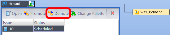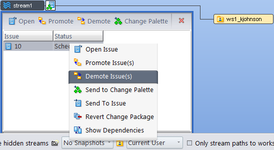 After you select a destination stream or workspace and click OK, the changes associated with the issue(s) are no longer present in the parent stream but are now active in the default group of the destination stream or workspace you specified.
