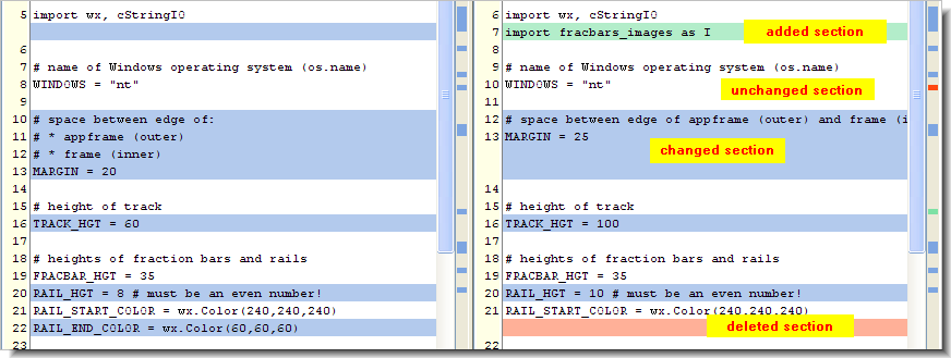 • Changed Section (blue background): Sometimes, the Diff tool decides that a text section in the "before" version has been revised, producing the corresponding section in the "after" version. The before and after sections are not necessarily the same length, in which case some empty space is displayed in one of the versions. Both the before and after sections appear with a blue background. Both sections contain red character highlights, indicating the first location in a line where the two versions differ: