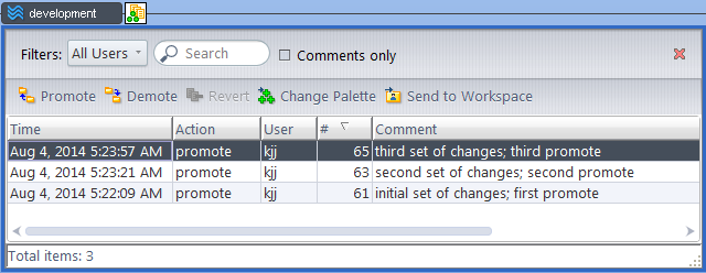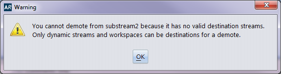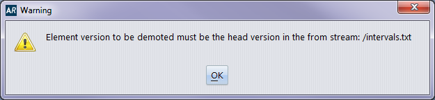 Demote by Transaction Rather than demoting individual files, you can also demote a set of element versions by demoting a transaction. When you demote by transaction, the specific versions of the files in that transaction are no longer available in the source stream but they are now accessible in the destination stream. The process of demoting by transaction enables you to leave previous versions of demoted elements active in the source stream. You cannot do this when demoting by file. For example, suppose that you make three successive changes to a file and promote it after each change. If the file is problematic, demoting it by file means that the source stream now contains the version of the file that is in the backing stream. If, instead, you demote by transaction, you can demote the most recent transaction which leaves the previous version of the file active in the source stream. The ability to demote a single transaction while leaving previous transactions in the source stream means that you can exercise a finer granularity of control over the intermediary versions of a file contained in the source stream than when demoting by file. For this reason, AccuRev recommends demoting by transaction as a best practice. How to Demote by Transaction To demote a transaction: 1. In the StreamBrowser, specify Active Transactions as the Active Group Mode. 2. Click the Show Active Transactions button to the right of the source stream. Alternative: Right-click the source stream and choose Show Active Transactions from the context menu. AccuRev displays a list of transactions: 3. To demote a transaction, select the transaction (say, for example, #65) and click Demote. Note: You can demote multiple transactions at once, but the transactions you demote must be consecutive for an element and they must contain the most recent transaction. If, for example, you attempted to demote just transaction #63, AccuRev displays the following warning: 4. If the current stream has more than one child stream or workspace, AccuRev displays a dialog box that lets you choose the destination for the demote. Select the destination stream or workspace and click OK. Note: If you attempt to demote from a stream that does not have a child stream or workspace, AccuRev displays the following warning: When the demote operation has succeeded, transaction #65 and the file versions it contains have been moved out of the source stream (in this case, the Dev stream) and into the destination stream.