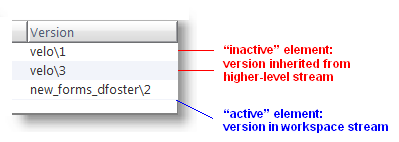 • Workspace: If you have modified an element, but not yet promoted it to the backing stream, the version-ID indicates a version in the workspace stream. These are described as "active elements", or as "members of the workspace's default group". For inactive elements (those you have not modified or activated with Anchor or Send to Workspace), the Version column indicates a version from some higher-level stream, which your workspace stream inherits.