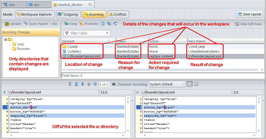 The Incoming Changes mode displays all of the changes that have occurred in the workspace’s parent stream since the last time you refreshed your workspace content (called
