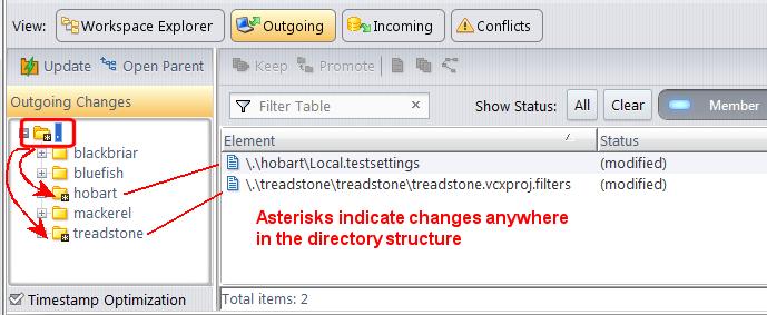 \treadstone\treadstone subdirectory, and not at the directory root (as is the case with the change in the \hobart directory). Similarly, the root node is marked with an asterisk if there are changes anywhere in the workspace or stream.