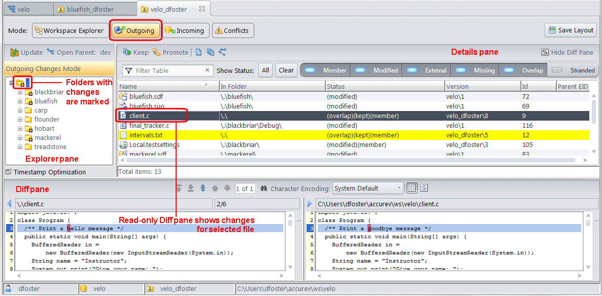 Tip: Since the Outgoing Changes mode shows only changes in the workspace or stream, the Details pane will be empty if you click a directory that is