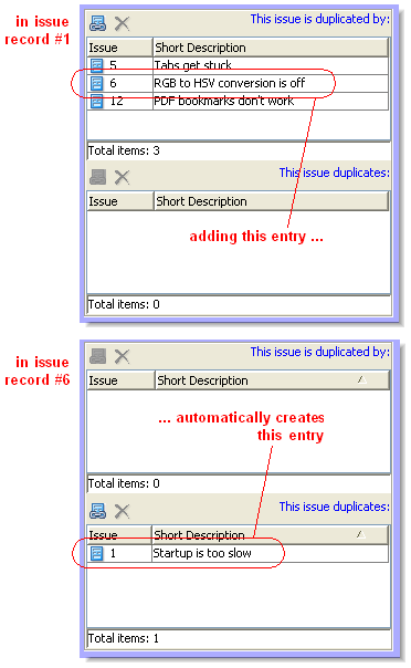 On the other hand, "A duplicates B" is the same as "B is duplicated by A". This means that when you add an entry to the top table of one issue record, AccuWork automatically adds it to the bottom table of the other issue record (and vice-versa).