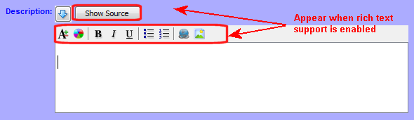 Show Source button Displays the HTML source for formatted text. When clicked, the button text changes to Hide Source. Clicking the Hide Source button reverts the display to formatted text only.