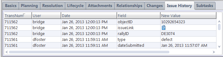 If you double-click any row of the Issue History table, AccuWork opens a read-only Issue form, showing the state of the issue record at the time of that particular Save operation. (Exception: the issue record's change package does not participate in this feature.)