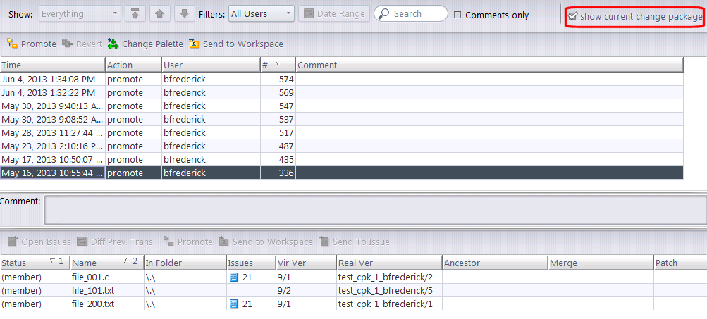 file_200.txt is no longer associated with Issue #21’s change package. If you wanted to see the file’s change package association at the time of the selected transaction, you would clear the