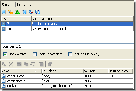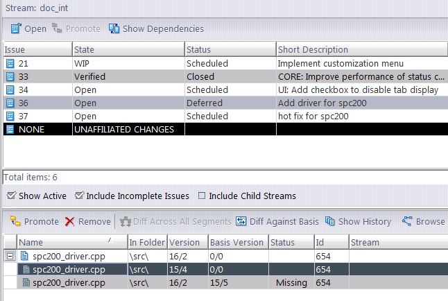 Show Incomplete is cleared): promotes each currently-active head version in the issue's change package to the parent stream. That is, if a version listed in the Version column is currently active in the stream on which you invoked the
