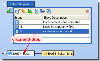 • Drag-and-dropping the issue record(s) onto another stream or workspace in the Stream Browser display. The destination can be the parent (backing) stream, another dynamic stream, or one of your workspaces. This invokes a Promote or Send to Workspace operation on all the elements in the selected issue record(s).You can also drag-and-drop the subwindow control to another stream. This performs the Promote or Send to Workspace operation on all the issue records in the subwindow (even if only some of them are currently selected).Note: in the remainder of this technical note, we shorten the term “issue record” to “issue”.Note: if Promote fails with a “merge required” error, you must perform a merge for one or more elements in the source workspace (or a workspace below the source stream). When promoting the merged version(s), assign them to the same issues as the original version(s).In this scenario, your intention is the same as in the preceding one — to cross-promote the versions in one or more issues from one dynamic stream to another. Before proceeding, please see the definition of the following terms in the AccuRev Glossary chapter of the AccuRev Concepts Manual: direct, indirect, incomplete, cyclical, and coalesce.You start the same way, with a drag-and-drop operation from stream brs34_able to stream brs34_baker: