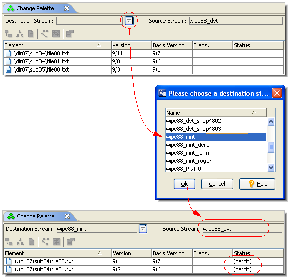 Also, using the Change Palette with issues has some special considerations that are covered in Working with the Issue Change Palette.If you've loaded versions into the Change Palette using Send to Change Palette, you've already indicated the source stream, but need to specify the destination stream or workspace. (The drag-and-drop operation indicates both the source and destination.)A dialog appears, listing all of the depot's streams and workspaces. Select one to be the destination for subsequent commands (Send to Workspace, Promote, Merge, and/or Patch) on the versions in the Specified Versions pane.As the example shows, AccuRev determines a status for each element, describing the relationship between the source-stream version and the destination-stream version. Entries with (overlap) status are highlighted in yellow.