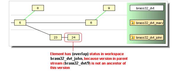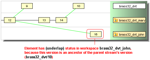 • (underlap) — similar to overlap: the element has changed both in the backing stream and in your workspace, but the changes in your workspace have already been promoted to the backing stream. (More precisely, your version is an ancestor of the backing stream’s version.) In many cases, no promote is required; you can just purge the changes from your workspace, restoring the version that was in the backing stream at the time of the workspace’s most recent update. Prior to AccuRev 4.6, “underlap” files were considered to have “overlap” status.In a new workspace, the status of every element is backed. This means that the version in your workspace is identical to the version in the backing stream. The following sections describe the other statuses.As soon as you make a change to an element, its status changes to modified. The element's status stays “modified” until you do a keep or purge on it. If the element is purged, its status reverts to “backed”.When you add a new element or keep an existing element, its status becomes kept. The element stays “kept” until you do a purge or promote on it (which changes the status to “backed”), or make a change to it (which changes its status to “modified”).Note: the examples in this section were taken from the Version Browser in the AccuRev GUI to better illustrate the circumstances that lead to (overlap) and (underlap) statuses.Prior to AccuRev 4.6, (overlap) status was defined as follows:Version W, in a workspace or stream, has (overlap) status if version P in the parent stream is not an ancestor of version W.Version P is not an ancestor of version W, but Version W is an ancestor of version P.That is, the changes in the workspace or stream’s version already appear in the parent stream. This is not considered to be an (overlap), but a new status, called (underlap).The example below illustrates a common (underlap) scenario: john brings an old version, brass32_dvt_mary/12, of the element into his workspace, using the co (GUI: Send to Workspace) command; this old version is an ancestor of the version currently in the backing stream of john’s workspace.