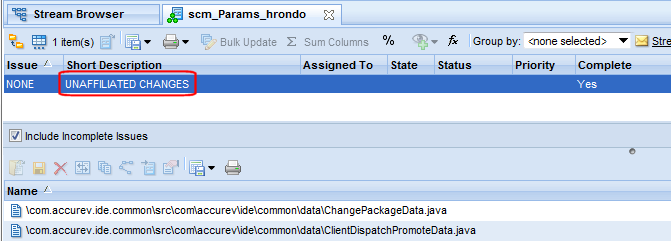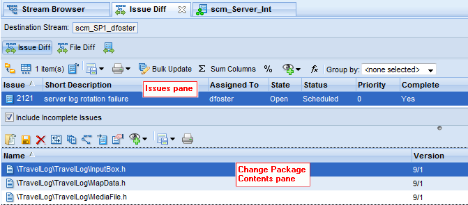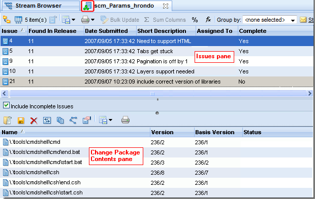 incomplete when some, but not all, of its change package entries are in the stream.) When the checkbox is selected, the Complete column appears and shows the incomplete issues with a grey background in the Issues pane. When an incomplete issue is selected, the missing versions will be shown with a grey background on the Change Package Contents pane. In addition, the Status column on that pane will read (