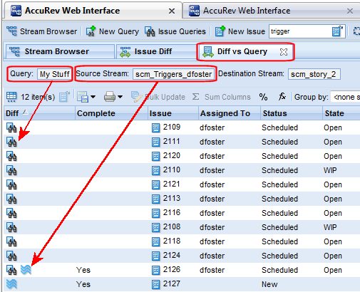 Issue Diff commands available throughout the Web UI. This tab shows the source and destination streams for the comparison, and a list of issues which differ between the two streams.