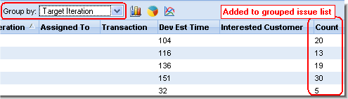 The resulting issue list shows one line for each value of the chosen field. A Count column is added to the grouped issue list, which contains the number of issues for each value of the chosen field.