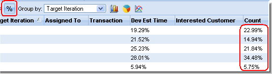 ) toggles the display of percentage information for columns that contain numeric data. If you have specified the display of Groups (see the next section), the Count column also toggles to percentages. This is useful for columns such as “estimated time” to see which issues in the current table are expected to take up the most development time. See
