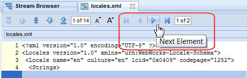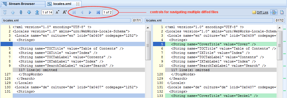 In this example, the file currently displayed in the Diff tab is locales.xml. One other file was selected for diffing at the same time, as indicated by the value 1 of 2. In this example, you would use either the Next Element or Last Element to display the second diffed file.Note: You can diff text files only. Examples of text files include files with .txt, .h, .hpp, .c, and .cpp extensions. You cannot diff binary files. If you select both text and binary files, AccuRev displays a warning and allows you to complete or cancel the diff operation.