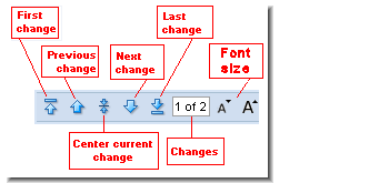 3. To examine the diffs in the next file you selected in Step 1, click the Next Element button, as shown in the following illustration:See Obtaining Web UI Links for more information on this topic.The Diff Against command lets you compare two versions of a text file. It is available in the File Browser, History Browser, and change package entries on the Issues and Changes tabs. See Using AccuWork™ for more information about issues and change packages.